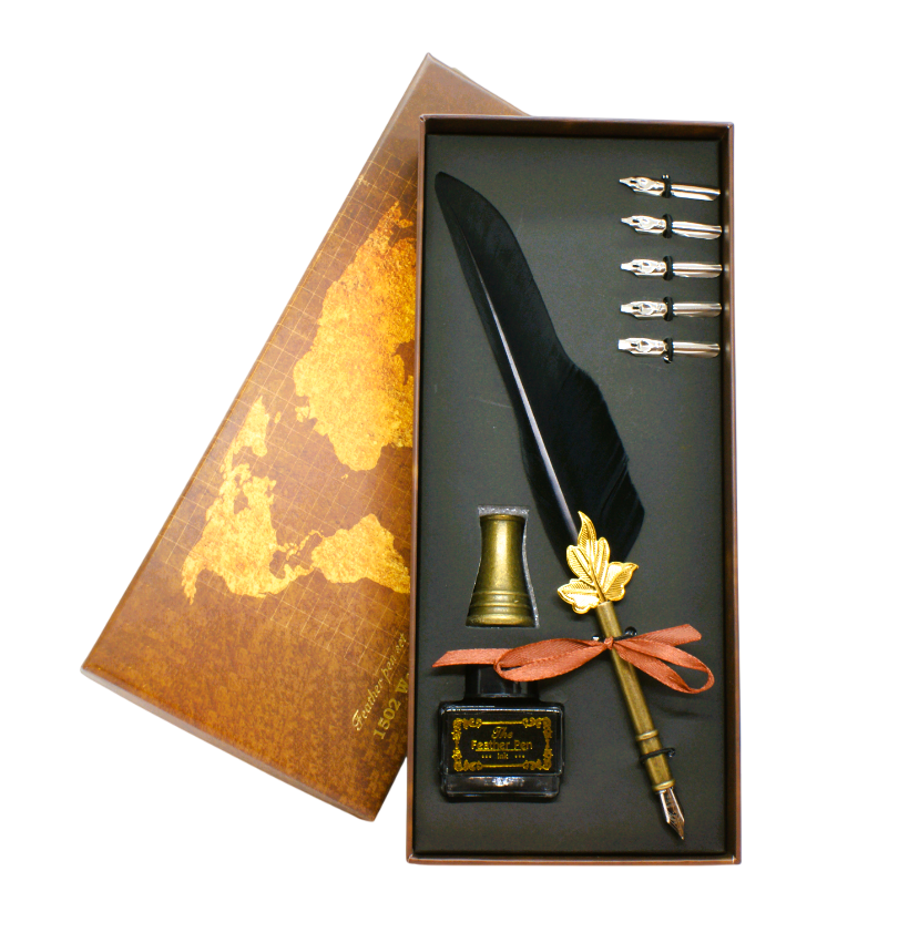 Detta ingår:1 st fjäderpenna1 st låda1 st hållare till pennan1 st svart bläck6 st olika spetsar