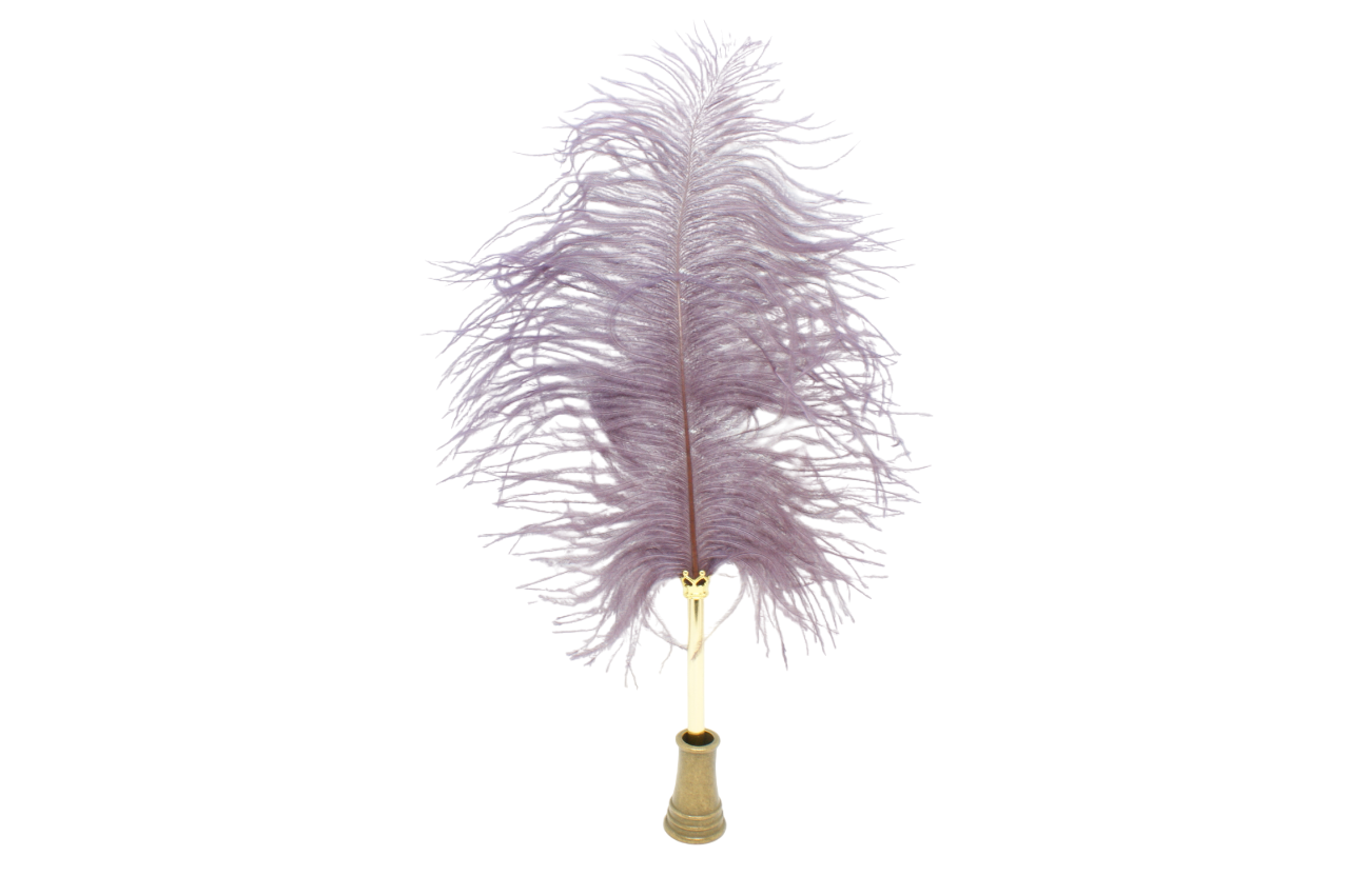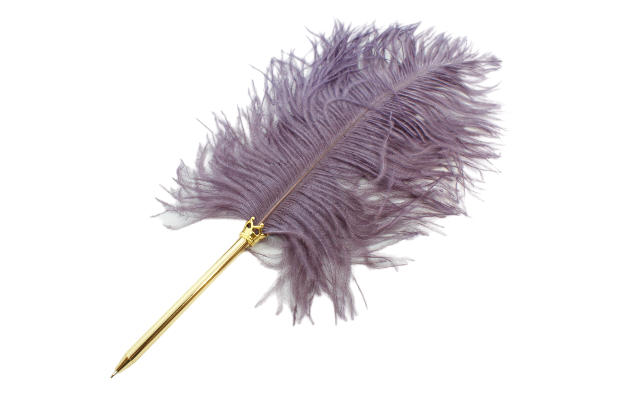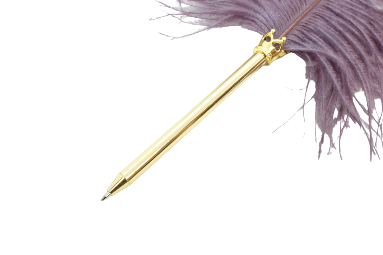 Här är en fin kulspetspenna med en vacker lila fjäder. Pennan är i en blank guldfärg och bläcket i pennan är svart.