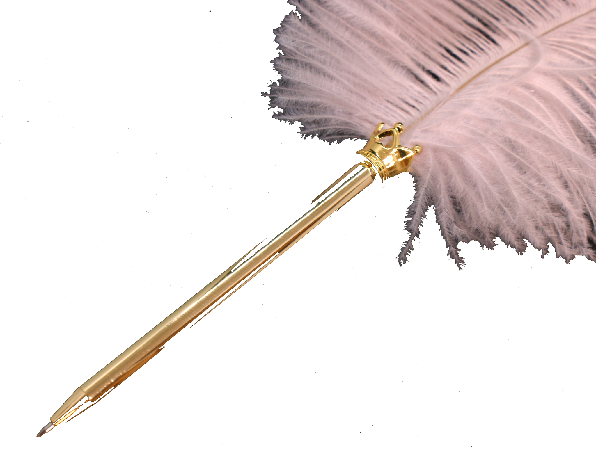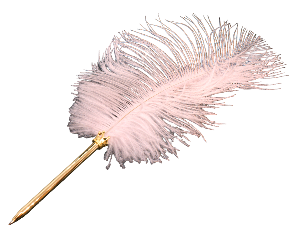 Här är en fin kulspetspenna med en vacker rosa fjäder. Pennan är i en blank guldfärg och bläcket i pennan är svart.