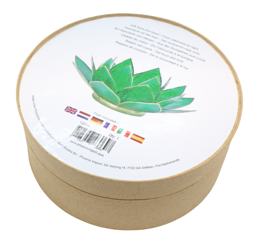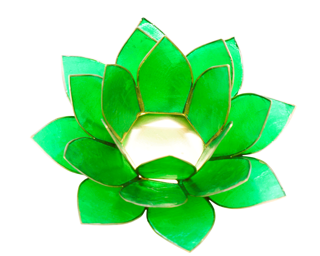 En vacker ljuslykta i form av en grön lotusblomma. Blommans blad är tillverkade av snäckskal och metall. Passar till värmeljus som har diameter på ca 3,5 cm